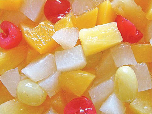 原材料:黄桃、雪梨、パインアップル、ぶどう、チェリー、みかん、砂糖、純水、クエン酸、L-アスコルビン酸